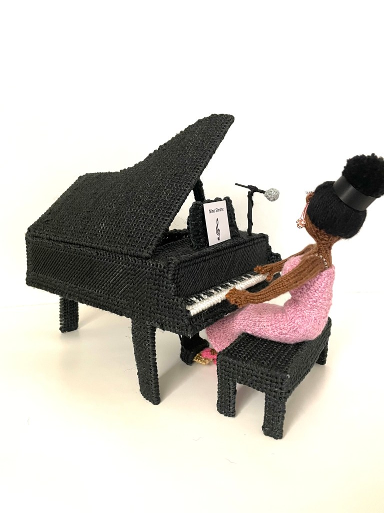 I knitted my Nina doll, and I made her piano and bench with plastic canvas and yarn.